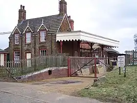 Architecturally, the station resembles North Wootton station, with a small main station building on the up platform and a small waiting room provided on the down platform; both had Great Eastern–style canopies. A small goods yard adjoined the main station building, and a standard Great Eastern gabled signal box was sited on the southern end of the down platform. A level crossing lay at the northern end of the station and, in common with other stations on the line, convenient lodging accommodation, a solidly built Carstone inn known as "The Alexandra Hotel", was to be found opposite the station approach.[5]