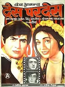 Des Pardes (lit. 'Home and Abroad') is a 1978 Hindi drama film, produced and directed by Dev Anand. This family drama stars Dev Anand and Tina Munim (in her debut film), with Ajit Khan, Pran, Amjad Khan, Shreeram Lagoo, Tom Alter, Bindu, Prem Chopra, A. K. Hangal, Sujit Kumar, Mehmood and Paintal in the supporting cast. For the first time, Dev Anand chose comparatively new music director Rajesh Roshan for this film, who did full justice to his selection as most of the songs became quite popular. The film received a Filmfare award for its sets and also received a nomination for best music director. Upon release, the film was an average success. However, over the years, it has garnered a cult following and is regarded as a classic.