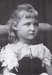 ![]() | Princess Charlotte of Prussia | 24 July 1860 Potsdam, Prussia | 19 October 1919 Baden-Baden, German Republic | Married 1878 Bernhard of Saxe-Meiningen, (1851–1928), later Duke Bernhard III (1914–1918), with issue (1 daughter): Princess Feodora (12 May 1879 – 26 August 1945), — Queen Victoria's first great-grandchild. Modern medical tests revealed that both Charlotte and her daughter suffered from porphyria, which had afflicted their ancestor King George III.[10] |