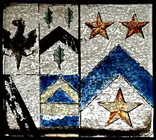 William de Holne held the manor in the reign of King Edward I (1272–1307), and in the same reign, according to "Savage",[1] Walter Barun (or Bidun) held a portion of it. Ten acres of arable and two acres of meadow land were held from the king in chief by the serjeanty "of hanging on a certain forked piece of wood the red deer that died of the murrain in the forest of Exmoor, and also of lodging and entertaining at the tenant's expense such poor or decrepit persons as came to him, for the souls of the ancestors of King Edward I".[1] The canting arms of de Holne, Argent, a chevron sable between three holly leaves erect proper, are visible in the second quarter of the arms of Charles Steyning (d.1592) which survive in a 16th-century stained glass window fragment now in the stable block at Holnicote, formerly in the demolished manor house.[2] the arms are as follows:[2]