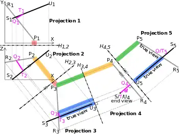 To get points Q and T on these lines giving this shortest distance, projection 5 is drawn with hinge line H4,5 parallel to P4R4, making both P5R5 and S5U5 true views (any projection of an end view is a true view). Projecting the intersection of these lines, Q5 and T5 back to projection 1 (magenta lines and labels) allows their coordinates to be read off the X, Y and Z axes.