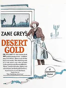 Desert Gold is a 1926 American silent Western film directed by George B. Seitz. According to silentera.com the film survives while Arne Andersen Lost Film Files has it as a lost film.[1][2] Portions of the film were shot near Palm Springs, California.[3]: 168–71 It is based on the 1913 novel of the same name by Zane Grey.