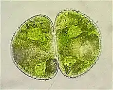 Desmidiales, commonly called the desmids (Gr. desmos, bond or chain), are an order in the Charophyta, a division of green algae in which the land plants (Embryophyta) emerged.[2] Desmids consist of single-celled (sometimes filamentous or colonial), microscopic green algae. Because desmids are highly symmetrical, attractive, and come in a diversity of forms, they are popular subjects for microscopists, both amateur and professional.[3]