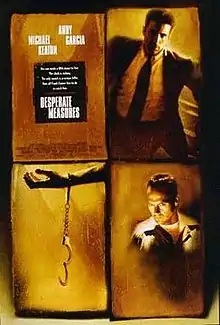 Desperate Measures is a 1998 American action thriller film starring Michael Keaton, Andy García, Marcia Gay Harden and Brian Cox, directed by Barbet Schroeder. It was filmed in both the San Francisco Bay Area and downtown Pittsburgh with such landmarks as the BNY Mellon Center, the Allegheny County Courthouse[1] and the Oakland Bay Bridge. The film was released on January 30, 1998 and was a critical and financial failure. However, Andy García won an ALMA Award for "Outstanding Actor in a Feature Film in a Crossover Role".