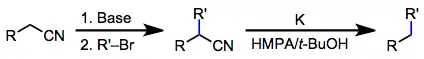As α-cyano carbanions may be used in many of the same contexts as α-sulfonyl anions, reductive decyanation methods offer a viable alternative to reductive desulfonylation. Dissolving metal reductions are most useful for the decyanation of tertiary nitriles (primary and secondary nitriles give the corresponding amines in addition to decyanated products),[23] but potassium is a more general reducing agent that reduces primary, secondary, and tertiary nitriles.[24]