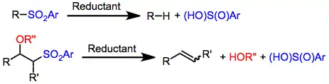 Desulfonylation reactions are chemical reactions leading to the removal of a sulfonyl group from organic compounds. As the sulfonyl functional group is electron-withdrawing,[1] methods for cleaving the sulfur–carbon bonds of sulfones are typically reductive in nature. Olefination or replacement with hydrogen may be accomplished using reductive desulfonylation methods.[2]