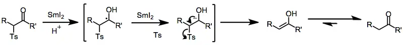 Samarium(II) iodide may be used to reductively cleave α-keto sulfones;[5] in the presence of hexamethylphosphoramide (HMPA), SmI2 is able to effect reductive elimination of α-functionalized sulfones (see equation (11) below).
