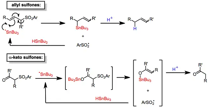 Tin hydrides reduce α-keto[6] and allylic[7] sulfones. The mechanisms of these processes involve the addition of a tin-centered radical to the substrate followed by elimination of a sulfinyl radical, which abstracts a hydrogen from a molecule of tin hydride to propagate the radical chain. Protonation of the organotin intermediates thus formed (by sulfinic acid generated in situ) leads to reduced products. Addition of a stoichiometric amount of proton source allows the use of tin hydride in catalytic amounts. Although desulfonylations of allylic sulfones are site selective (providing only products of allylic transposition), they are not stereoselective and afford mixtures of double bond isomers.[7] The mechanism of desulfonylation of α-keto sulfones is similar.[6]