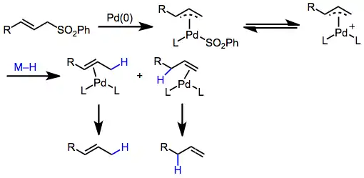Transition-metal-mediated reductive desulfonylations rely on the generation of an intermediate π-allyl complex, which undergoes nucleophilic attack by hydride or another nucleophile to afford reduced products.[8] Nucleophilic attack generally occurs at the less substituted position of the π-allyl moiety, although site selectivity depends strongly on the substrate and reaction conditions. Palladium(0) complexes are the most commonly used precatalysts.