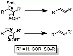 Sulfones with a good leaving group in the β position may undergo reductive elimination under desulfonylation conditions to afford alkenes. This process is a key step of the Julia olefination, which yields alkenes via addition of an α-sulfonyl carbanion to an aldehyde followed by reductive elimination. Sodium amalgam[9] or samarium(II) iodide/HMPA[10] may be used to convert β-sulfonyloxy or β-acyloxy sulfones to the corresponding alkenes. The key mechanistic step of this process is elimination of an anionic or organometallic intermediate to generate the alkene.