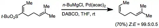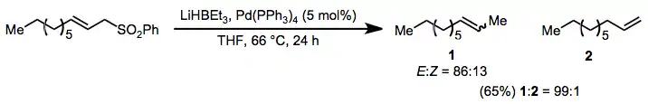 A significant issue associated with the reduction of allylic sulfones is transposition of the allylic double bond, which occurs in varying amounts during reductions by metal amalgams.[14] and tin hydrides[15] Palladium-catalyzed reductive desulfonylations of allylic sulfones do not have this issue, and afford allylic sulfones with high site and stereoselectivity.[8]