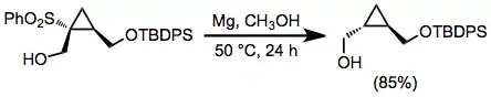 Alkyl sulfones may be reduced with sodium or lithium in liquid ammonia;[11] however, the strongly basic conditions of these dissolving metal reductions represent a significant disadvantage. In alcoholic solvents, magnesium metal and a catalytic amount of mercury(II) chloride may be used.[12] A wide variety of functional groups are unaffected by these conditions, including many that are transformed by dissolving metal reductions. Reductive desulfonylation with these reagents does not occur in reactions of β-hydroxy sulfones, due to the poor leaving group ability of the hydroxyl group.[13]