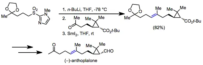 The modest acidity of carbons adjacent to the sulfonyl group has made sulfones useful for organic synthesis. Upon removal of the sulfonyl group with desulfonylation or reductive elimination, the net result is the formation of a carbon-carbon bond single or double bond between two unfunctionalized carbons, a ubiquitous motif in synthetic targets. In a synthesis of (–)-anthoplalone, Julia olefination was used to establish the (E)-alkene in the target.[21]
