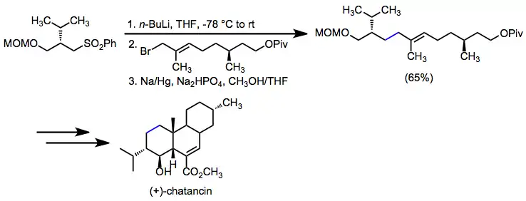 Reductive desulfonylation is employed when the establishment of a carbon-carbon single bond is the goal. In a synthesis of (+)-chatancin, alkylation of an α-sulfonyl carbanion followed by desulfonylation established a key allylic carbon-carbon bond.[22]