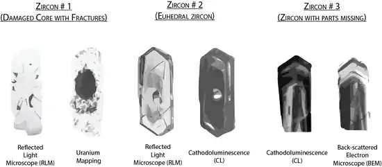 | Type of instrument for zircon analysis | In modern research, common instruments for U-Pb analysis are sensitive high-resolution ion microprobe (SHRIMP), inductively coupled plasma mass spectrometry (LA-ICPMS) and thermal ionization mass spectrometry (TIMS). Ion microprobe (non-SHRIMP) and lead-lead evaporation techniques were more commonly used in older research. | ||||||||||||||||||||