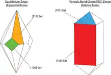 | Zircon morphology | ![]() Fig. 5 – Diagram illustrating two major forms of zircon and their sets with miller indices, with reference to Corfu et al. (2003) and Wang and Zhou (2001) Different zircon shape corresponds to different crystallization medium (chemistry and temperature). A general crystal shape classification would be: