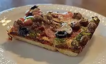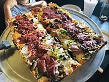 Detroit-style pizza is a rectangular pan pizza with a thick, crisp, chewy crust. It is traditionally topped to the edges with Wisconsin brick cheese, which caramelizes against the high-sided heavyweight rectangular pan. Detroit-style pizza was originally baked in rectangular steel trays designed for use as automotive drip pans or to hold small industrial parts in factories.[1] It was developed during the mid-20th century in Detroit, Michigan, before spreading to other parts of the United States in the 2010s. It is one of Detroit's iconic local foods.