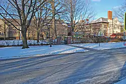In 1913, the school decided to develop an eastern branch campus to serve students on the city's east side.[7] This site in Indian Village along Charlevoix was chosen, and the school again contracted Albert Kahn to design a new building.[8][9] The building is one of only three schools designed by Kahn, and the only one still extant.[10] Kahn's design for the school drew from then-popular English influences,[11] and was a radical departure from previous school designs, both in his extravagant use of windows and use of stucco rather than brick.[9] The building opened the following year as the "Eastern Liggett" branch.[8] In 1916, landscape architect O. C. Simonds designed a landscape plan for the school.[12]