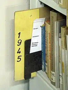 The German Library in Frankfurt am Main (Deutsche Bibliothek abbreviated: DB) was a predecessor of the German National Library (DNB).[1] From 1947 to 1990 it was the West German counterpart to the Deutsche Bücherei in Leipzig, founded in 1912, with the task of collecting German documents and publishing the national bibliography.[2] After the reunification of Germany in 1990, the German Library and the German Library were merged to form "The German Library". Since 2006 it has been called the "German National Library".[3] In 2006, around 8.3 million of the total holdings of the German National Library of 22.2 million units were stored in Frankfurt am Main. At the end of 2011, out of a total of around 27 million media copies, 10 million were archived in Frankfurt.[4]
