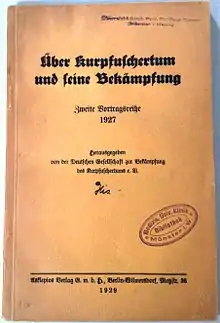 Since 1899, there was a Quackery Commission in the umbrella organisation of physicians' associations, the Ärztlicher Vereinsbund.[3] This led Carl Alexander to found the DGBK in 1903.[4] After the first annual general assembly of 14 January 1904, the DGBK started providing information and cooperated on legislative measures, to which end several commissions were formed.[3] With pamphlets and lectures, lay people as well as professionals were educated.[3] There was lobbying against naturopathy, antivaxxers and also doctors who practised homeopathy. The association primarily sought to warn the public against unskilled lay healers. In 1911, the DGBK participated with the DGBG in the International Hygiene Exhibition of Karl August Lingner, the founder of Odol (a mouthwash brand), in Dresden, to which other organisations were demonstratively not invited.[5] In response, in the summer of 1911 a counter-event was held entitled "Congress of Naturopathy and People's Welfare".[6] The association managed to combine left and conservative forces alike[4] and organise travelling exhibitions.[7] In 1927, 53,000 paying visitors came to an exhibition in Ludwigshafen.[8]