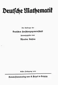 Deutsche Mathematik (German Mathematics) was a mathematics journal founded in 1936 by Ludwig Bieberbach and Theodor Vahlen. Vahlen was publisher on behalf of the German Research Foundation (DFG), and Bieberbach was chief editor. Other editors were Fritz Kubach, Erich Schönhardt, Werner Weber (all volumes), Ernst August Weiß (volumes 1–6), Karl Dörge, Wilhelm Süss (volumes 1–5), Günther Schulz (de), Erhard Tornier (volumes 1–4), Georg Feigl, Gerhard Kowalewski (volumes 2–6), Maximilian Krafft, Willi Rinow, Max Zacharias (volumes 2–5), and Oswald Teichmüller (volumes 3–7).[4] In February 1936, the journal was declared the official organ of the German Student Union (DSt) by its Reichsführer, and all local DSt mathematics departments were requested to subscribe and actively contribute.[5] In the 1940s, issues appeared increasingly delayed and bunched; the journal ended with a triple issue (due Dec 1942) in June 1944.[6][7]