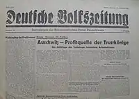 In the summer of 1945 Deutsche Volkszeitung ran a number of articles about anti-fascist resistance in the concentration camps during the war.[12] An article in the 5 August 1945 issue of the newspaper claimed that Siemens had produced and installed the crematoria and gas chambers at Auschwitz.[13] Siemens denied the claim, contracted a lawyer and threatened legal actions against the newspaper. Deutsche Volkszeitung repeated the claim in its 22 August 1945 issue. The Siemens chairman Wolf-Dietrich von Witzleben then responded by writing to Lewis Lyne, Commandant of the British Sector in Berlin, asking him to take action against the newspaper. Witzleben was arrested twice by Allied troops following the Deutsche Volkszeitung articles.[13]