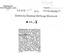 The Deutsche Zentral-Zeitung (DZZ; German Central Newspaper) was the German-language newspaper published in Moscow by the German-speaking section of the Communist International. The newspaper's type was set in Fraktur (see image) and contained translations of Russian articles and speeches, reviews, articles from and about other countries, and it publicized pronouncements and information from the Communist Party. Published for little over a decade, the newspaper ceased publication in 1939 after Soviet secret police (NKVD) arrested so many of the staff that it no longer had enough people to continue operation. The newspaper remained without a successor until 1957.