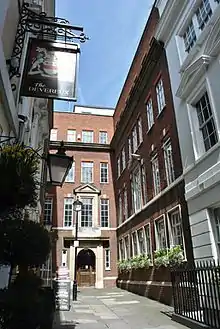 It is occupied by some barristers' chambers and three public houses: The George, The Devereux, and the Edgar Wallace. The Devereux stands on the site of the celebrated Grecian Coffee House, which shut in 1843.