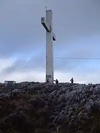 A cross was erected on the Rock in 1953–1954 in celebration of the 'Marian Year dedicated by the Roman Catholic Church. A committee was formed and planning of the work began in early 1953 and construction began in September of that year, it was constructed by the Duggan Brothers. The project manager was Stephen (Steedie) Grey of Templemore. Work was completed at a cost of approximately IR£2,000.[11] The cross was officially blessed by the Archbishop of Cashel and Emly, Most Rev. Dr. Jeremiah Kinane, on Sunday, 22 August 1954. It stands 45 feet high and has a span of 25 feet. The base of 340 tons is 5 feet squared and 10 feet deep. All tools and materials for this construction project were carried to the Rock by hand. The cross is presently illuminated at night. Holy Mass is celebrated at the base of the Rock each year on Rock Sunday, which is the closest Sunday to the feast of St James (25 July). A statue of the Virgin Mary was erected in 1988 on the eastern side of the Rock.