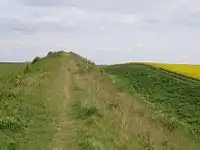 Devil's Dyke or Devil's Ditch is a linear earthen barrier, thought to be of Anglo-Saxon origin, in eastern Cambridgeshire and Suffolk. It runs for 11 kilometres (6.8 mi) in an almost straight line from Reach to Woodditton, with a 10-metre-high (33 ft) ditch and bank system facing southwestwards, blocking the open chalkland between the marshy fens to the north and the formerly wooded hills to the south.[1][2] It is a Scheduled Monument, a biological Site of Special Scientific Interest and a Special Area of Conservation.