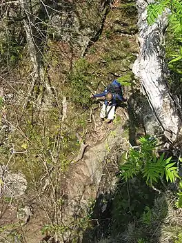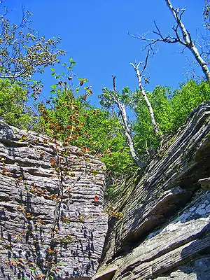 The Devil's Path is a hiking trail in the Greene County section of the Catskill Mountains of New York, sometimes described as one of the more challenging trails in the New York Tri-state area.[1] It goes across the eponymous mountain range and then three other peaks to the west, offering hikers and peakbaggers a chance to reach the summits of five of the 35 Catskill High Peaks (two more are reachable by detours). It draws hikers from not just the region but far outside, due to the challenging climbs straight up and down the steep gaps between the four peaks of the range, which often require hikers to use hands as well as feet to pull themselves almost straight up cliffs and through rocky chutes. These climbs, however, lead to views across the Catskill range.