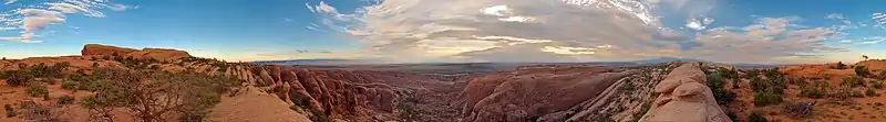 Devils Garden[note 1] is an area of Arches National Park, located near Moab, Utah, United States,[2] that features a series of rock fins and arches formed by erosion.[3] The Devils Garden Trail, including more primitive sections and spurs, meanders through the area for 7.2 mi (11.6 km).[4] The trailhead leads directly to Landscape Arch after a 0.8 mi (1.3 km) outbound hike, while Tunnel Arch and Pine Tree Arch can be seen on spur trails on the way to Landscape Arch.[3] Several other arches, including Partition, Navajo, Double O, and Private Arch, as well as the Dark Angel monolith and Fin Canyon, are accessed via the primitive loop trail and its spurs.[3]