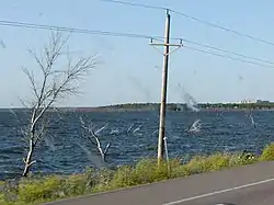 The low, flat terrain around Devils Lake consists of various coulees, channels, and basins, which may be separated during times of low water, or connected during high water.[11] Thus the boundaries of the lake can vary greatly from year to year, depending on the amount of precipitation.