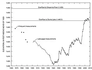 Devils Lake is well known for its wide variations in lake levels,[13] with large swings between low and high water levels. This owes in large part to its nature as a closed-basin lake, lacking a natural outlet. The release of water is dependent upon evaporation and seepage.[11]