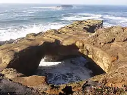 Devils Punch Bowl State Natural Area is a state day use park on the central Oregon Coast in the United States. It is centered on a large bowl naturally carved in a rock headland which is partially open to the Pacific Ocean. Waves enter the bowl and often violently churn, swirl, and foam.[1] Outside the bowl, ocean conditions are attractive to surfers near a large offshore rock pinnacle named Gull Rock, located about 1⁄2 mile (800 m) west-northwest of Devils Punch Bowl, which funnels and concentrates waves easily seen from the park. There are at least seventeen large rocks, part of Oregon Islands National Wildlife Refuge, which provide interesting wave viewing, and attract and provide a home for wildlife.