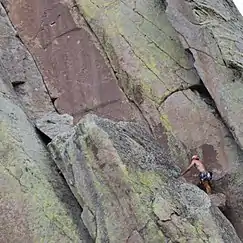 As of 1994, climbing Devils Tower had increased in popularity. About 1.3% of the monument's 400,000 annual visitors climbed Devils Tower, mostly using traditional climbing techniques.[30] The first known ascent of Devils Tower by any method occurred on July 4, 1893, and is credited to William Rogers and Willard Ripley, local ranchers in the area. They completed this first ascent after constructing a ladder of wooden pegs driven into cracks in the rock face. A few of these wooden pegs are still intact and are visible on the tower when hiking along the 1.3-mile (2.1 km) Tower Trail at Devils Tower National Monument. Over the following 30 years, many climbs were made using this method before the ladder fell into disrepair.