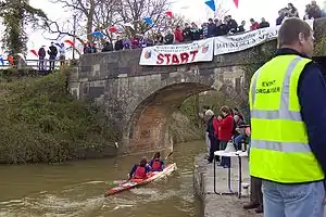 The Devizes to Westminster International Canoe Marathon is a marathon canoe race in England. The race is held every Easter over a course of 125 miles (201 km) from Devizes in Wiltshire to Westminster in central London. It has been run since 1948. Starting at Devizes wharf, the route follows the Kennet and Avon canal for 54 miles to Reading, where it joins the Thames. Another 54 miles later it reaches Teddington Lock, ending 17 miles later at Westminster Bridge.