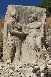 The dexiosis reliefs from Commagene are well known in which the then ruler is shown shaking hands with gods. Dexiosis reliefs are also known from Roman gravestones, which show the deceased with their spouses [1] Similarly, dexiosis reliefs are found on ancient coins and are they are intended to show bonds between two cities by shaking hands.