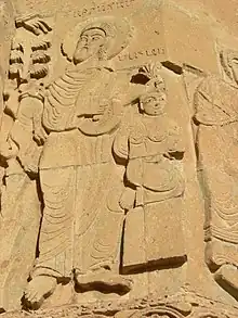 The hand often blesses rulers from above, especially in Carolingian and Ottonian works, and coins. The hand may hold a wreath or crown over the ruler's head, or place it on the head. A posthumous coin of Constantine the Great (the "deification issue") had shown the hand reaching down to pull up a veiled figure of Constantine in a quadriga, in a famously mixed message that combined pagan conventions, where an eagle drew deified emperors up to the heavens, with Christian iconography. From the late 4th century coins of Late Antique rulers such as Arcadius (and his empress), Galla Placidia and others show them being crowned by it – it was in fact mostly used for empresses, and often only appears on issues from the Eastern Empire.[26] This theme is not then seen in Byzantine art until the late 10th century, when it appears in coins of John I Tzimisces (969–976), long after it was common in the West.[27] In later Byzantine miniatures figures the hand is often replaced by a full figure of Christ (in these examples much smaller than the Emperor) placing a crown on the head.[28]