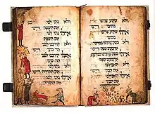 The hand of God appears in the early 14th-century Haggadah, the Birds' Head Haggadah, produced in Germany.[39] Two hands of God appear underneath the text of the Dayenu song, dispensing the manna from heaven. The Birds' Head Haggadah is a particularly important visual source from the medieval period, as it is the earliest surviving example of a medieval illuminated Hebrew Haggadah.