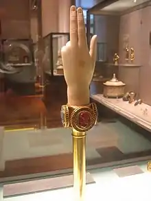 The similar but essentially unrelated arm-reliquary was a popular form during the medieval period when the hand was most used. Typically these are in precious metal, showing the hand and most of the forearm, pointing up erect from a flat base where the arm stopped. They contained relics, usually from that part of the body of the saint, and it was the saint's hand that was represented.