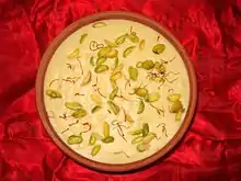 The saffron-mixed buttermilk (lassi) of Amritsar; milk boiled with almonds, pistachio, and dry-dates in winter; and the same mix boiled into a thick liquid and then solidified in a banana-shaped mould in the form of a kulfi are desserts. Panjiri, whole wheat flour fried in sugar and ghee, heavily laced with dry-fruits and herbal gums is in eaten in the winters to ward off cold.