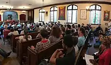 The temple's services are attended by a diverse demographic, with its largest demographic being young adult Caucasians.[19] The temple does not actively advertise itself and relies mostly on word of mouth to attract members. Its events are mainly coordinated online through platforms such as Facebook.[19] Dharma Bum Temple focuses on the development of its community around the structure of families, offering individual programs for each age group; including for young children, teenagers, and adults, and has a family program called the "Family Sangha".[20] Along with traditional Buddhist services, Dharma Bum Temple also hosts a Buddhism based support group called the "Recovery Sangha". The program combines elements of the traditional Twelve-Step Program with Buddhism and meditation to help drug and alcohol addicts overcome their addictions.[28][25] The temple hosts multiple Buddhism and meditation classes throughout the week. As of December 2018, its most popular weekly services were attracting around 70 people per class.[18]