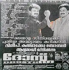 Dhosth (transl. Friend) is a 2001 Indian Malayalam-language action thriller film directed by Thulasidas. Dileep and Kunchacko Boban share the title role with Kavya Madhavan, Jagathy Sreekumar and Kalabhavan Mani in supporting roles.[1][2] It is a Malayalam remake of Tamil film Kannedhirey Thondrinal (1998).[3][4][5][6]