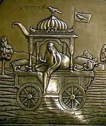 Dhumavati temples are extremely rare. At a temple in Varanasi, Dhumavati is the main deity. Smaller Dhumavati temples exist in Rajrappa in Bihar and near the Kamakhya Temple near Guwahati.[35] At the Varanasi temple, which claims to be a Shakti Peetha, Dhumavati's idol rides a chariot and holds a winnowing fan, a broom, and a pot, while the fourth hand makes the fear-not gesture (abhaya-mudra).[27] The goddess is offered usual offerings like flowers and fruit,[27] but also liquor, bhang, cigarettes, meat, and sometimes even blood sacrifices.[29] Though traditional devotees of Dhumavati (world renouncers and Tantrikas) worship at the Varanasi temple,[29] here the goddess transcends her traditional role as "the inauspicious, dangerous goddess who can be approached only by heroic tantric adepts".[31] Dhumavati acquires the role of a local guardian deity, or village deity, who protects the locals and even married couples worship her.[29][31] There is also a temple dedicated to the goddess in Pitambara Peeth temple complex, Datia.[41][42]