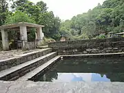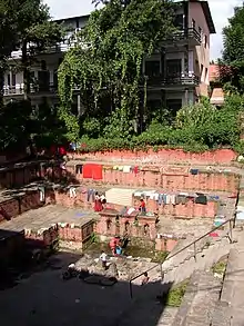 In the Nepalese countryside a hiti may be no more than a stone or brick wall with a spout protruding from it, with some paving beneath the spout.[4] In the cities, due to the natural flow of water (see below), the spouts are located in a basin below street level (hitigah), with the depth depending on need. This basin is built with a combination of stone and brick, where the floor is usually covered with stone slabs. The sides and bottom of the basin are made waterproof by coating them with a layer of kalo mato (a special type of black mud). This prevents water from the surrounding soil from seeping in.[5] Similarly a low wall around the basin helps to keep surface runoff out and prevents debris from being carried in by the wind. Depending on the depth and overall size of the basin it can have terraces on several levels. The hiti can be accessed via one or more stone stairs.[4]