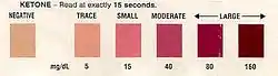 When testing urine for ketones, the sample needs to be as fresh as possible. Ketones evaporate quickly, so there is a chance of getting a false negative test result if testing older urine.[127] The urine testing strip bottle has instructions and color charts to illustrate how the color on the strip will change given the level of ketones or glucose in the urine over 15 (ketones–Ketostix) or 30 (glucose–Ketodiastix) seconds.[128] Reading the colors at those time intervals is important because the colors will continue to darken and a later reading will be an incorrect result.[114] Timing with a clock or watch second hand instead of counting is more accurate.[129]