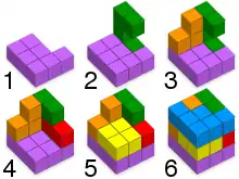 The diabolical cube is a three-dimensional dissection puzzle consisting of six polycubes (shapes formed by gluing cubes together face to face) that can be assembled together to form a single 3 × 3 × 3 cube.[1][2] The six pieces are: one dicube, one tricube, one tetracube, one pentacube, one hexacube and one heptacube, that is, polycubes of 2, 3, 4, 5, 6 and 7 cubes.