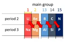 Further diagonal similarities have also been suggested for carbon-phosphorus and nitrogen-sulfur, along with extending the Li-Mg and Be-Al relationships down into the transition elements (such as scandium).[5]
