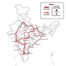 Prior to the 2014 general election, the two major national parties (Bharatiya Janata Party and Indian National Congress) pledged to introduce high-speed rail. The INC pledged to connect all of India's million-plus cities by high-speed rail,[2] whereas BJP, which won the election, promised to build the "Diamond Quadrilateral" project, which would connect the cities of Chennai, Delhi, Kolkata, and Mumbai via high-speed rail.[3] This project was approved as a priority for the new government in the incoming president's speech.[4] Construction of one kilometer of high speed railway track will cost ₹100 crore (US$13 million) – ₹140 crore (US$18 million) which is 10-14 times higher than the cost of construction of standard railway.[5]